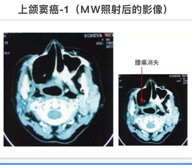 征得患者同意后。即于2005年1月20日开始,1天2次连续3天实施MW微波照射。之后11月、12月合计14次照射后,患者的癌症活性反应消失。