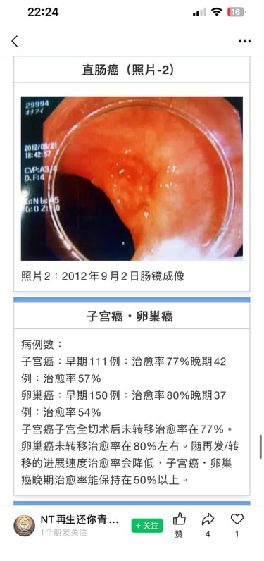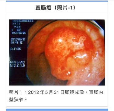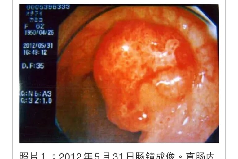 5月31日肠镜检查发现距离子宫癌较近的S形结肠部位有癌症转移。直肠内壁呈现肿瘤压迫狭窄。