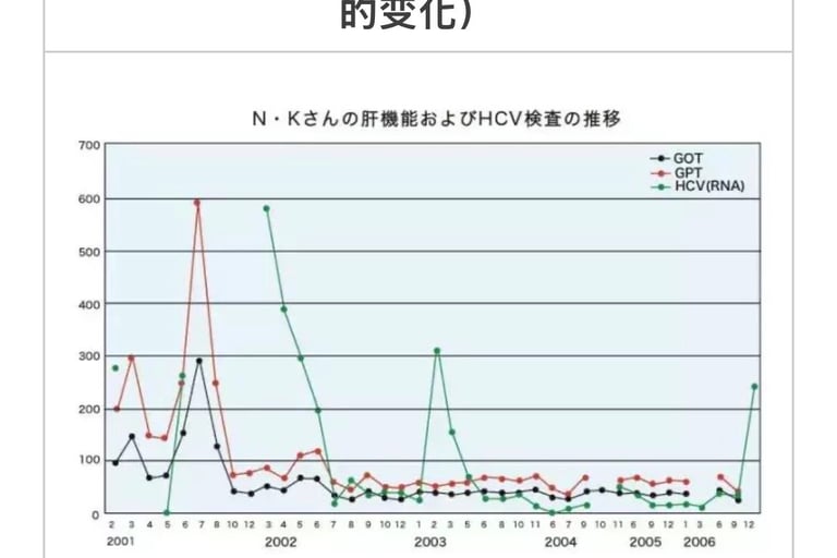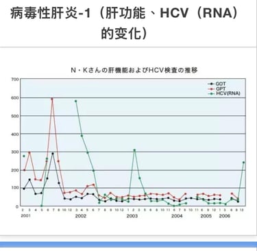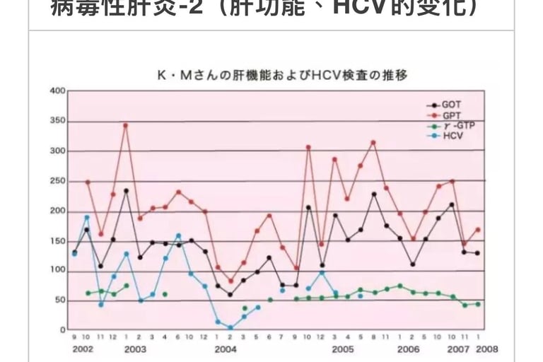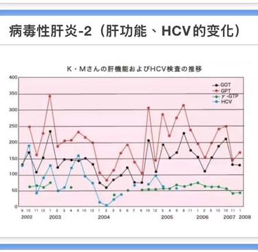 1957年、因交通事故输血。75年发现丙肝。2002年10月7日来我院就诊。HCV值为130KIU/㎖, GOT值600IU/ℓ偏高。