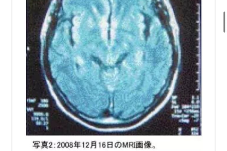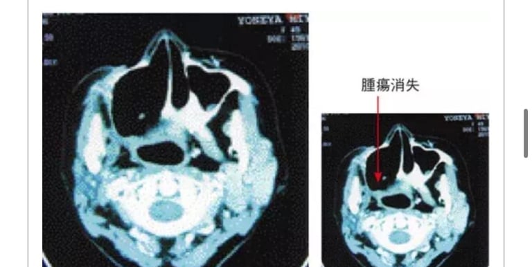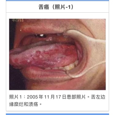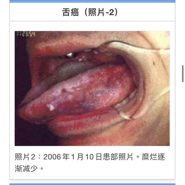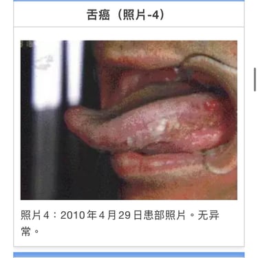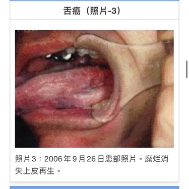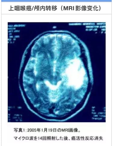 T・K(1964年生、男性)舌左边缘发生糜烂经口腔科就诊,摘取组织活检已扩散,棉棒取糜烂面组织检测结果恶性。患者需要大面积切除后再放疗。2005年11月4日来我院就诊。根据患者舌癌组织标本共振反应结果从前额到胸部均显阳性。颌下淋巴未发生肿胀,舌左边缘呈溃疡状(照片1)用非酒精蜂胶涂抹数次并进行MW微波照射。至2006年1月17日合计照射20次后,溃疡面上皮再生(照片2)。为预防扩散至2007年11月14日追加照射20次。初诊医师复诊患者时十分惊异。之后虽有少量糜烂和不适感,至12月12日坚持照射5次后基本恢复。周边淋巴肿胀消失。癌细胞活性反应消失,溃疡面上皮再生外观良好(照片3)。2010年1月癌细胞活性反应再发,持续照射后活性反应消失。3月头颈部MRI图像显示无异常(照片4) 3月の頭頸部MRIでも異状はない(写真4)。治疗开始持续7年,现在观察中。