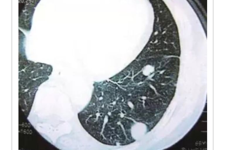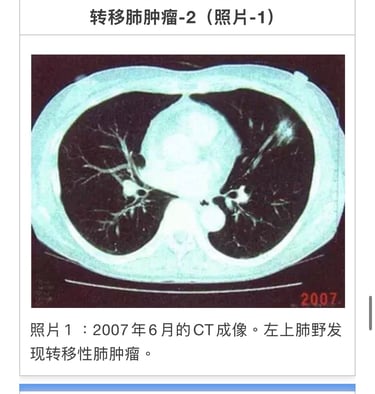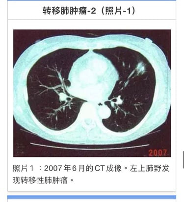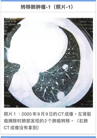 05年4月4日手术摘除。术后发现左肺2个和右上叶较小转移(照片1)。