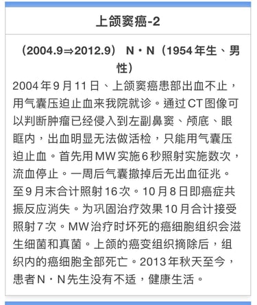 病例数:3例上颌窦癌没有自觉症状,3例均为晚期癌症均受到了良好效果。通过手术和放疗会对鼻腔形状和唾液腺分泌留有部分后遗症。MW治疗不会有任何的副作用。