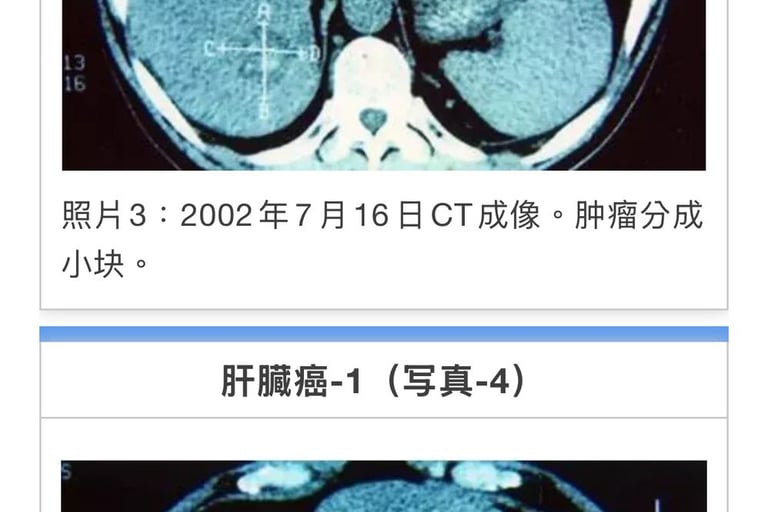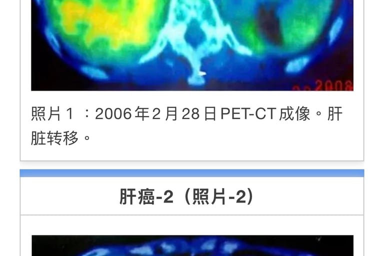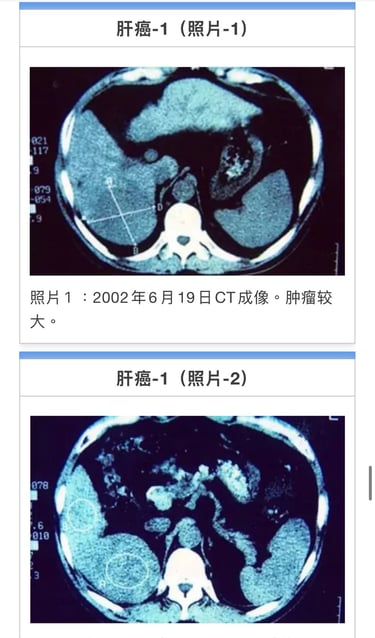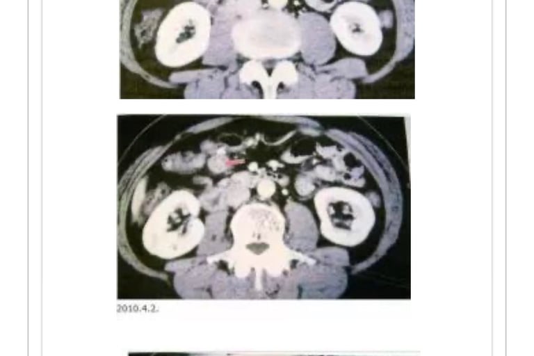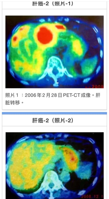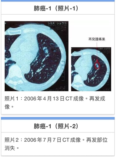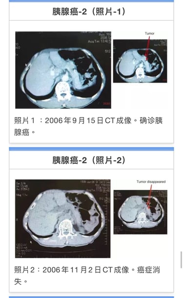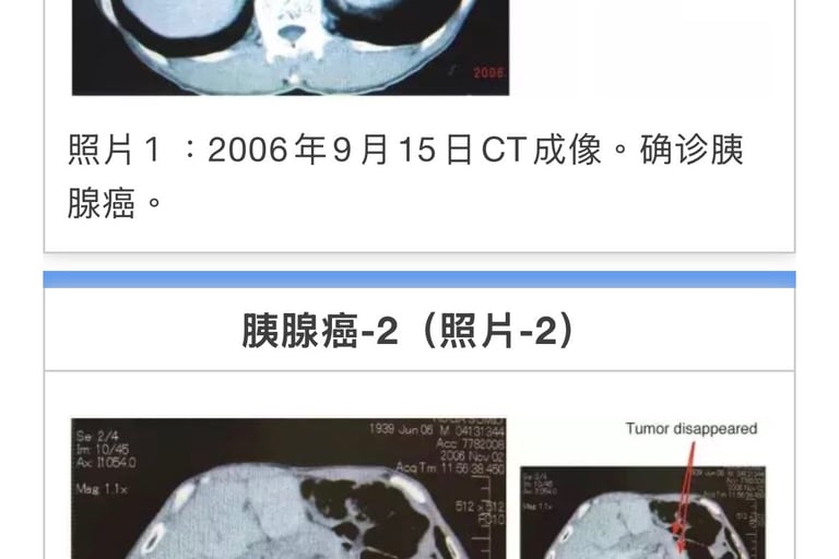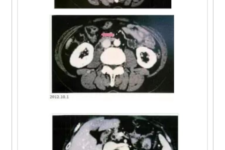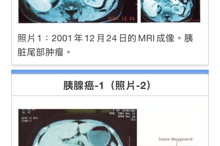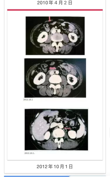 合计33次。癌症活性反应消失。11月15日CT检测胰腺癌阴影消失(照片2)。前期治疗医师承认针对患者有误诊。至12年2月。近7年患者恢复正常生活。