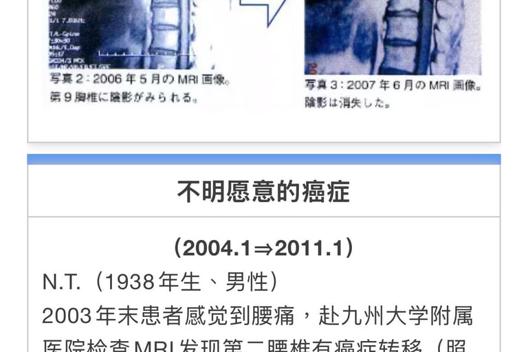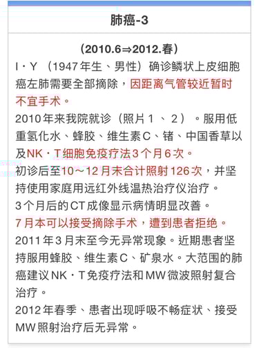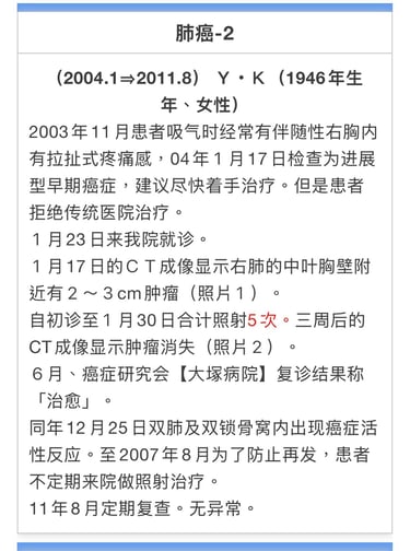 W・J(1951年生、男性)2010年4月14日患胃癌为全切除、非硬变癌症。周边淋巴组织主动脉壁发现肿胀物。化疗(静脉、口服)30次。被判定余命2-6个月。2011年8月停止化疗。2011年7月1日来我院就诊、至12月末合计照射22次。从10月开始身体好转。12月上旬CT成像显示3个淋巴肿涨中2个消失、12月下旬检测全部消失。之后没有不良反应。
