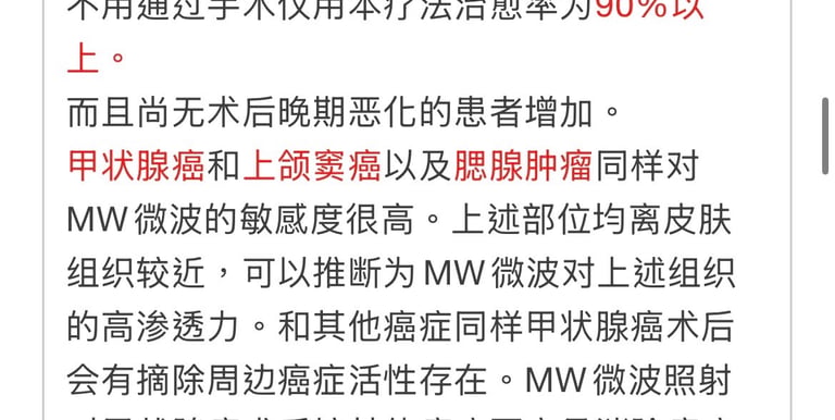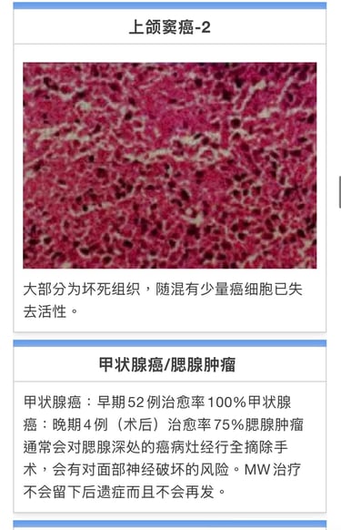 治愈率早期在90%、晚期在63%。对较难治疗的硬质病灶,MW照射虽难痊愈可以起到一定缓和效果。