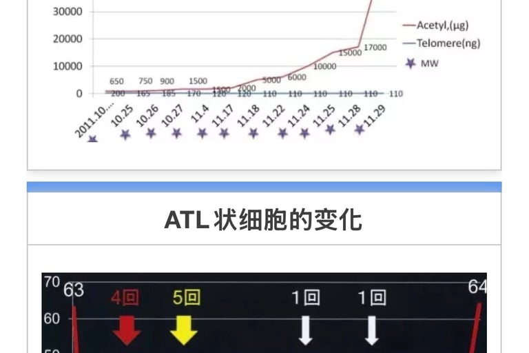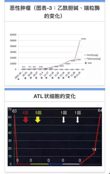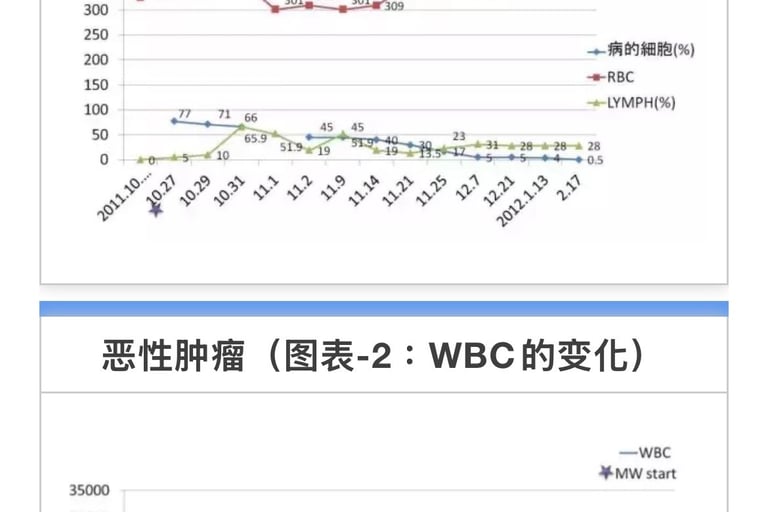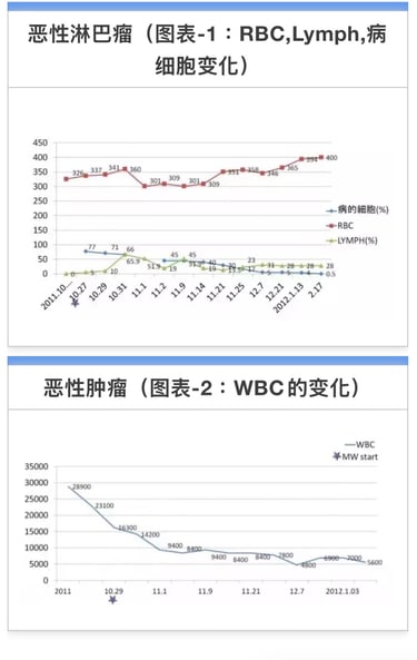 患者未向血液专科医生汇报。照射4天后的检查结果未发现白血病细胞,最终确诊为滤泡性淋巴瘤。淋巴结有多处肿胀,MW照射后变小。12月14日血液检查结果正常。共振检测癌症反应甚微。颈部淋巴结尚有肿胀,其他淋巴结均缩小。MW全身照射5分钟。未发现副作用。状况良好(图表1,2,3)。