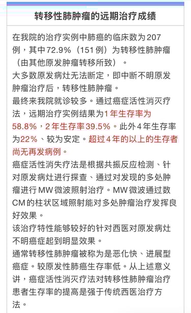 病例数:378例早期211例(手术有无)治愈率:71%晚期167例(手术后)治愈率:25%小细胞癌较鳞状上皮细胞癌治愈时间长。晚期治愈率在25%(常规治愈率为13%)。除明显呼吸困难和体能衰弱患者外,治愈率接近50%。转移性肺癌治愈率在24%,体能维持患者占50%以上。