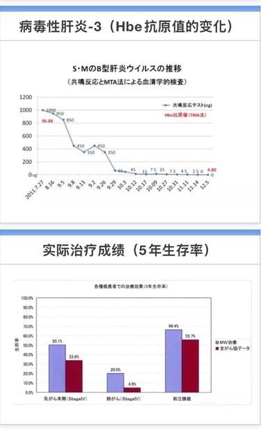 2011年7月27日来我院就诊。共振反应检查发现,上半身乳腺癌、全身乙肝病毒反应。就诊后开始MW微波照射治疗。至2011年11月8日合计照射26次后。HBV反应消失。至12月8日合计31次照射后,乳腺癌活性消失。经过核酸扩增法(TMA)测试后Hbe抗原从96.86LGE/ml降至4.8LGE/ml。