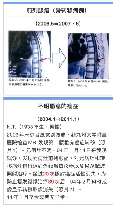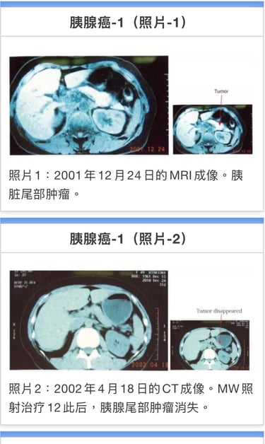 从8月20日至9月10日接受MW照射合计12回次。回家后结合使用远红外线温热仪器。02年4月18日的CT成像显示胰腺尾部肿瘤消失。