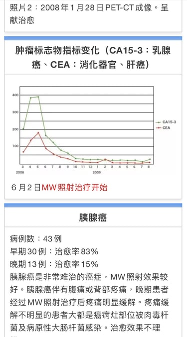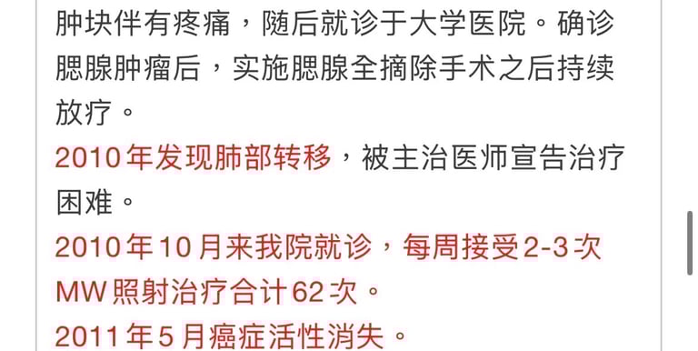 胰腺癌是非常难治的癌症,MW照射效果较好。胰腺癌伴有腹痛或背部疼痛,晚期患者经过MW照射治疗后疼痛明显缓解。疼痛缓解不明显的患者大都是癌病灶部位被肉毒杆菌及病原性大肠杆菌感染。治愈效果不理想。