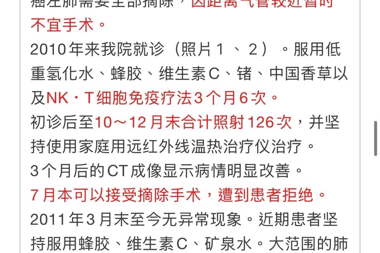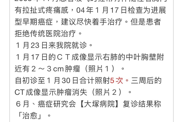 癌症晚期患者常被称为癌症难民,可以说和癌症斗争是患者的唯一选择,但是用什么方法患者又无法选择。我们倡导的第四治疗选择(无副作用),是为数不多的治疗法。